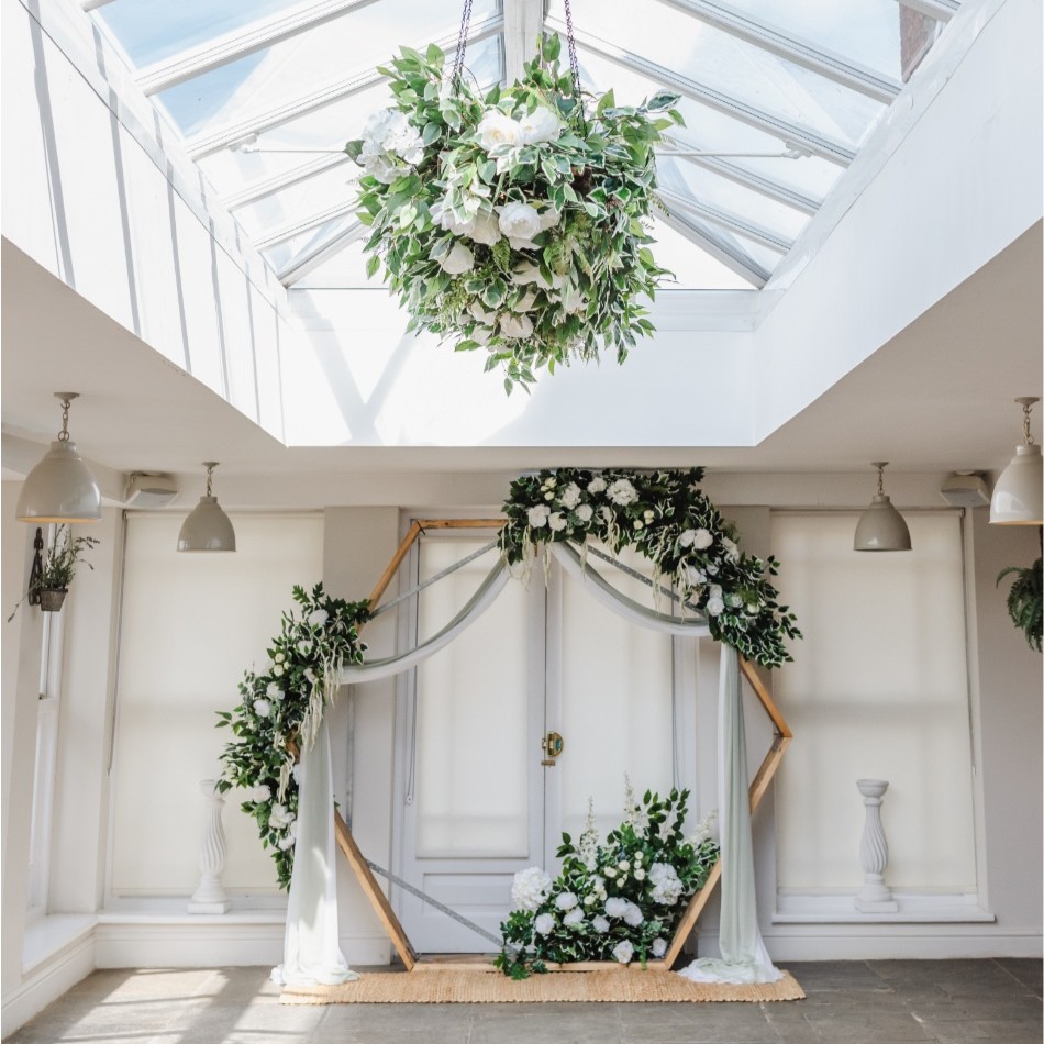 Your choice of TWO of our beautiful archways or backdrops (usually end of aisle and behind/above the top table).